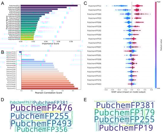 Visualization of feature importance analysis for the Pubchem fingerprint-driven RF-QSAR model: (A) Top 20 features from VIP analysis. (B) Pearson correlation analysis. (C) SHAP importance analysis. Tanimoto similarity-based clustering analysis of (D) highly active and (E) low active molecules from the Pubchem 2D fingerprint dataset.
