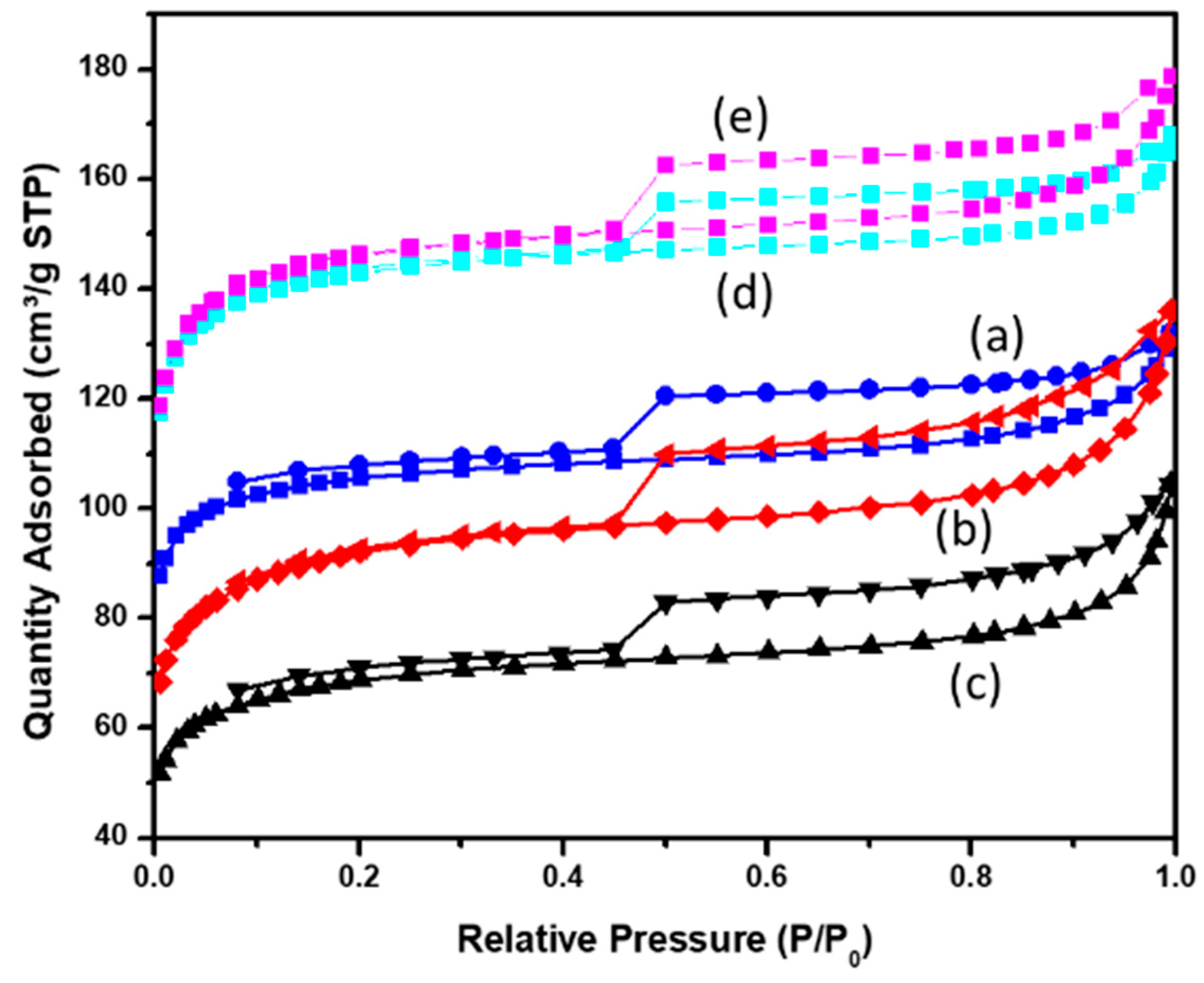 3.2.1. Surface Area and Porosity Characterization of Synthesized Samples by Gas Adsorption–Desorption