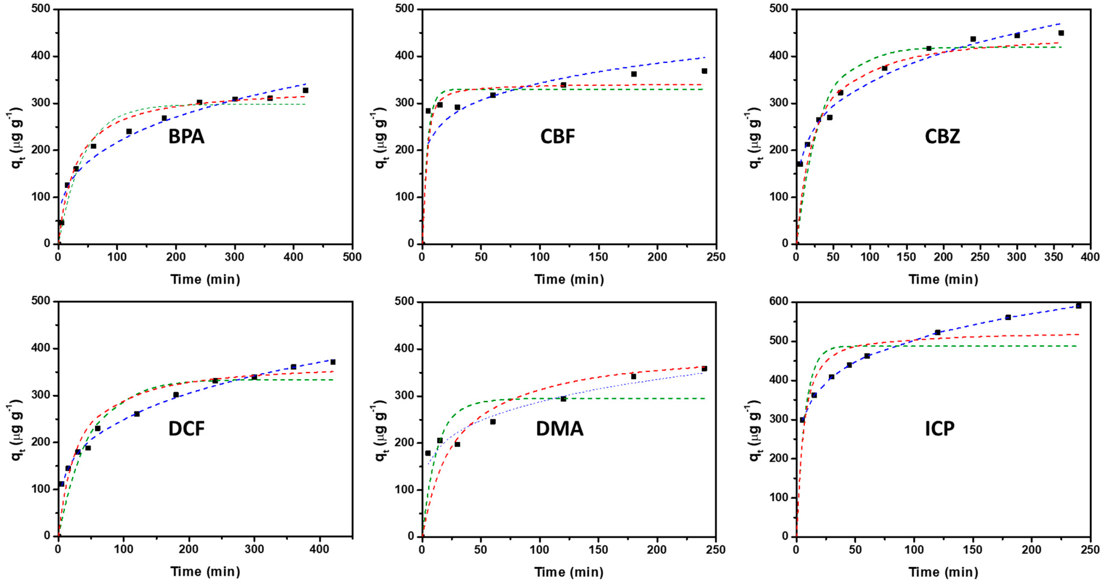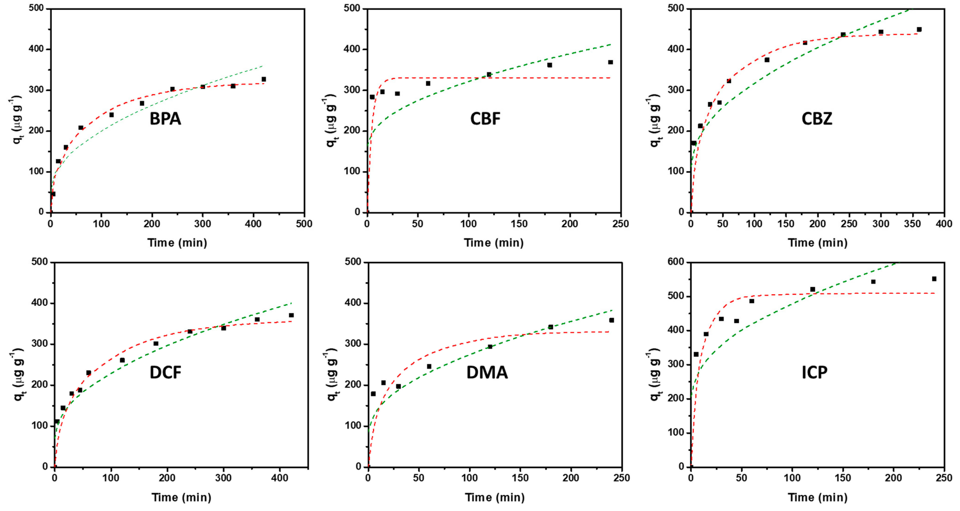 | EC Name | qe(exp) (µg.g−1) | Pseudo-First-Order Rate Parameters | Pseudo-Second-Order Rate Parameters | Elovitch Parameters | ||||||