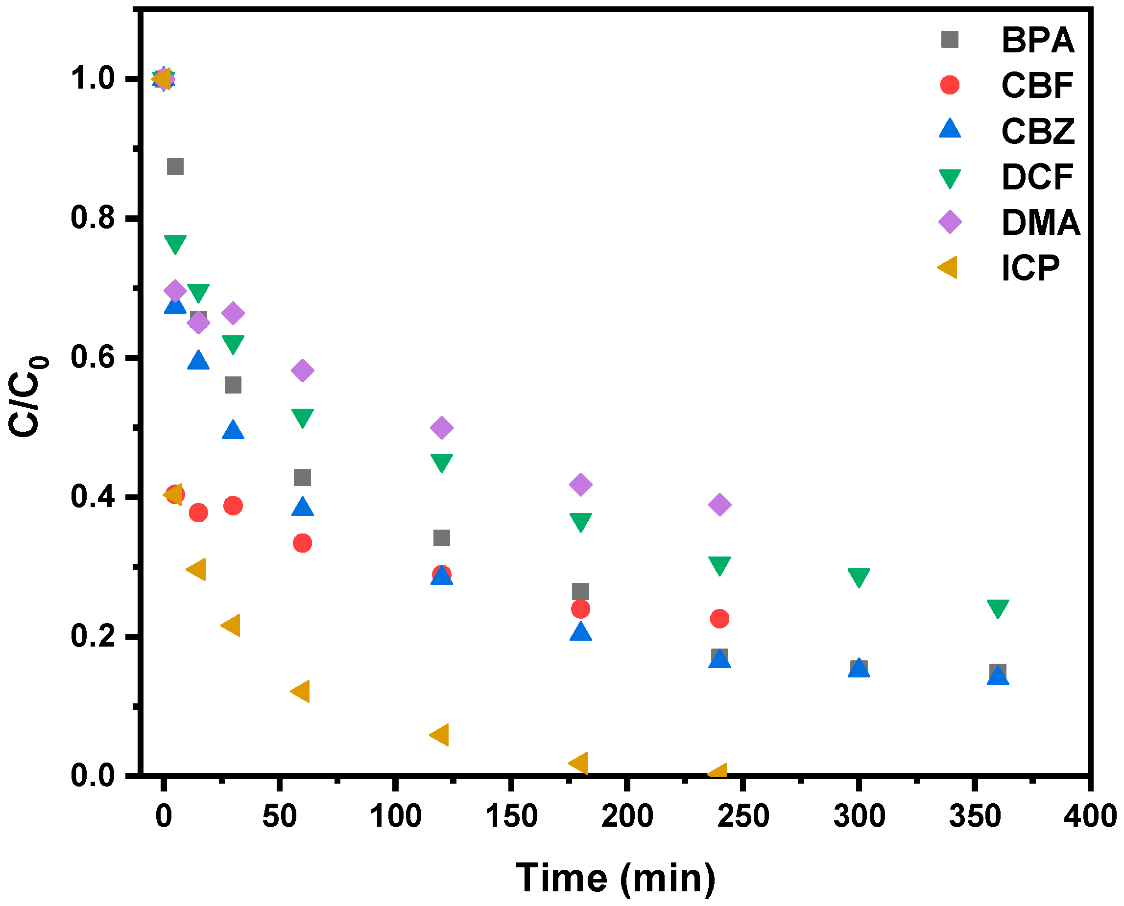 2.4. Adsorption Experiment for Mixture of ECs Removal