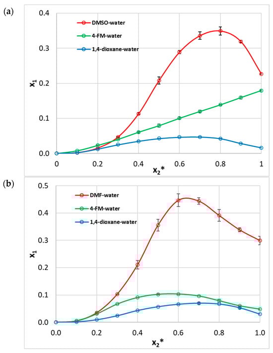 Mole fraction solubility of caffeic acid (CAF) and ferulic acid (FER) at 25 °C in binary aqueous–organic solvent systems: (a) CAF and (b) FER. Solubility is expressed as the mole fraction of solute (x1) and plotted against the mole fraction of the organic component (x2*) in the solute-free mixture.