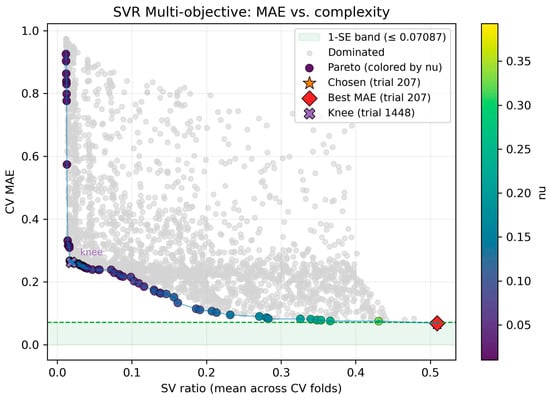 To explicitly manage the inherent trade-off between model accuracy and simplicity, a dual-objective optimization (DOO) strategy was implemented using the Optuna framework (v. 3.2) [,,]. The TPE sampler within Optuna was configured to simultaneously minimize two competing objectives, which were evaluated using a 5-fold cross-validation scheme on the training data. The first objective was predictive accuracy, quantified by the mean absolute error (MAE). The second objective was model complexity, quantified by the mean support vector (SV) ratio. The SV ratio is calculated for each fold as the number of support vectors divided by the number of training samples in that fold, providing an intrinsic measure of complexity for nuSVR models. A model with a lower SV ratio is considered more parsimonious.