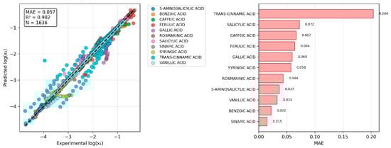 Predictive performance of the final model. The parity plot compares experimental and predicted solubility (log(x1)) for all 1656 data points, colored by solute. The model exhibits high accuracy (MAE = 0.057) and explanatory power (R2 = 0.982). The solute-wise distribution of points shows no systematic bias for the majority of compounds illustrating consistent performance across diverse phenolic acid structures. The distribution of the MAE for each solute is provided in the right panel.