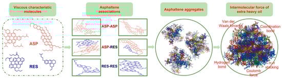Figure 1 shows the major interactions and formation process of highly viscous extra-heavy oil. Heavy oil contains large amounts of asphaltene, Ni, V, O, N, S, and other elements [,]. The π-π stacking between thick aromatic hydrocarbons, hydrogen bonding between heteroatoms, and complexation caused by heavy metal ions in the molecular structure form dense layered asphaltene, which aggregates into highly dense asphaltene [,]. Asphaltene is formed through aggregation and entangling, and the aggregates further form a strong viscoelastic resin system with a three-dimensional network structure, resulting in a sharp increase in viscosity. π-π stacking and hydrogen bonding also contribute as the thickening factors []. Another important factor affecting the viscosity of heavy oil is wax crystals, which affect the flow performance of crude oil at low temperatures []. At temperatures above the wax evolution point, the wax dissolves in the crude oil. When the temperature is lower than the wax evolution point but higher than the freezing point, the wax gradually crystallizes out, and the viscosity of crude oil increases significantly because of the strong interaction between the wax crystals. If the temperature is lower than the freezing point, the wax crystals will further connect to form a 3D network structure, and the crude oil will lose its fluidity.