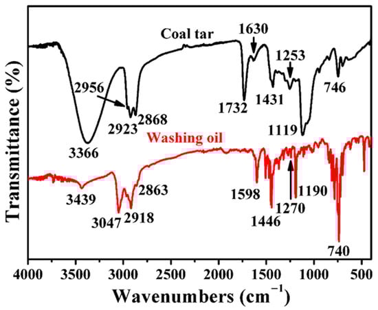 The FT-IR spectra of the separated components of coal tar and washing oil were measured, and the results are presented in Figure 5, where the absorption peaks of aliphatic CH3- and -CH2- asymmetric stretching vibrations (2923 and 2918 cm−1) and symmetric stretching vibrations (2868 and 2863 cm−1) appear. The absorption peaks of in-plane bending vibrations (1431 and 1446 cm−1) were also obtained [,]. The absorption peaks of coal tar and washing oil at 746 and 740 cm−1 were caused by the oscillating vibration of -(CH2) n-; the amount of adjacent -CH2- is more than four, indicating the presence of a long-chain hydrocarbon structure []. The stretching vibration absorption peaks of aromatic C-H appeared at 2956 and 3047 cm−1 for coal tar and washing oil, and the stretching vibration peaks of the aromatic C=C skeleton appeared at 1630 and 1598 cm−1, respectively, indicating the existence of aromatic groups.