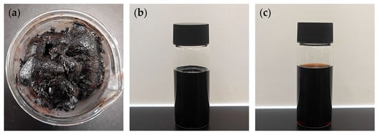 Photos of extra-heavy oil, coal tar, and washing oil: (a) extra-heavy oil; (b) coal tar; (c) washing oil.