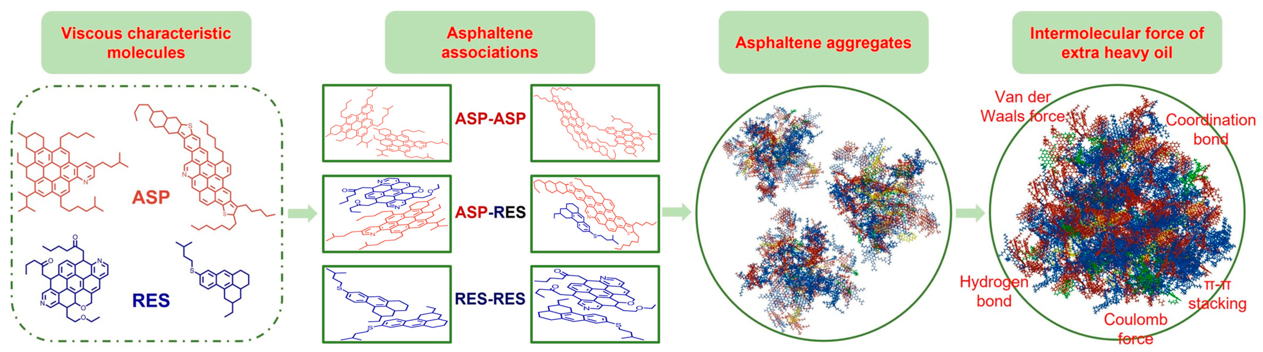 Figure 1 shows the major interactions and formation process of highly viscous extra-heavy oil. Heavy oil contains large amounts of asphaltene, Ni, V, O, N, S, and other elements [9,10]. The π-π stacking between thick aromatic hydrocarbons, hydrogen bonding between heteroatoms, and complexation caused by heavy metal ions in the molecular structure form dense layered asphaltene, which aggregates into highly dense asphaltene [11,12]. Asphaltene is formed through aggregation and entangling, and the aggregates further form a strong viscoelastic resin system with a three-dimensional network structure, resulting in a sharp increase in viscosity. π-π stacking and hydrogen bonding also contribute as the thickening factors [13]. Another important factor affecting the viscosity of heavy oil is wax crystals, which affect the flow performance of crude oil at low temperatures [14]. At temperatures above the wax evolution point, the wax dissolves in the crude oil. When the temperature is lower than the wax evolution point but higher than the freezing point, the wax gradually crystallizes out, and the viscosity of crude oil increases significantly because of the strong interaction between the wax crystals. If the temperature is lower than the freezing point, the wax crystals will further connect to form a 3D network structure, and the crude oil will lose its fluidity.