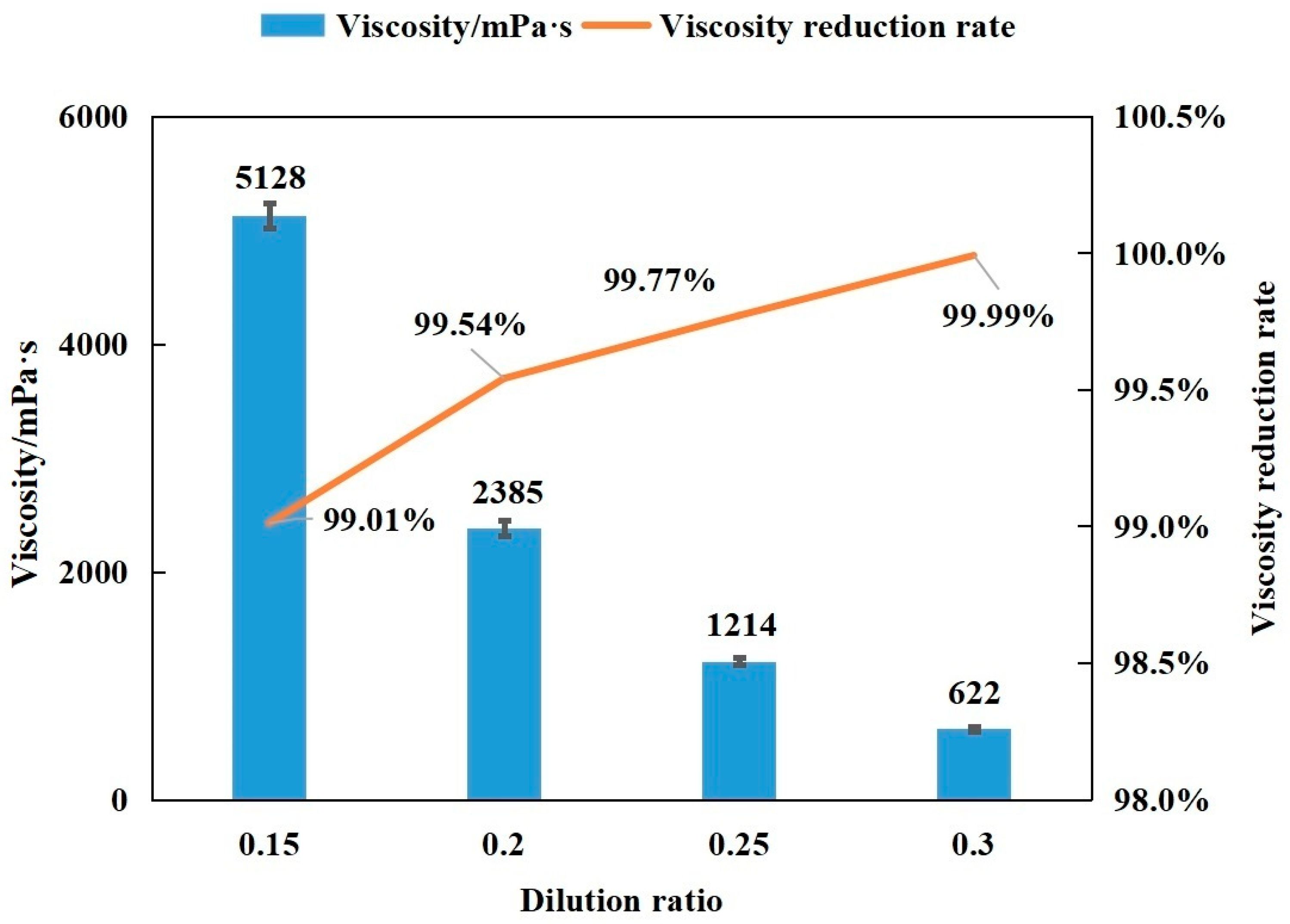 Viscosity measurement of mixtures: The samples were removed and stirred again to ensure uniformity. Viscosity testing was performed using an NDJ-5S digital viscometer (Shanghai Jingtian Electronic Instrument Co., Ltd., Shanghai, China; instrument accuracy: ±1%) with rotors No. 3 and No. 4 at rotational speeds of 30 and 60 rpm. The reported viscosity values represent the average of at least three independent measurements. The viscosity of all samples in this study was measured at 50 °C (the pipeline transportation temperature in the oilfield). The viscosity reduction rate of extra-heavy oil after dilution is shown in Formula (1):