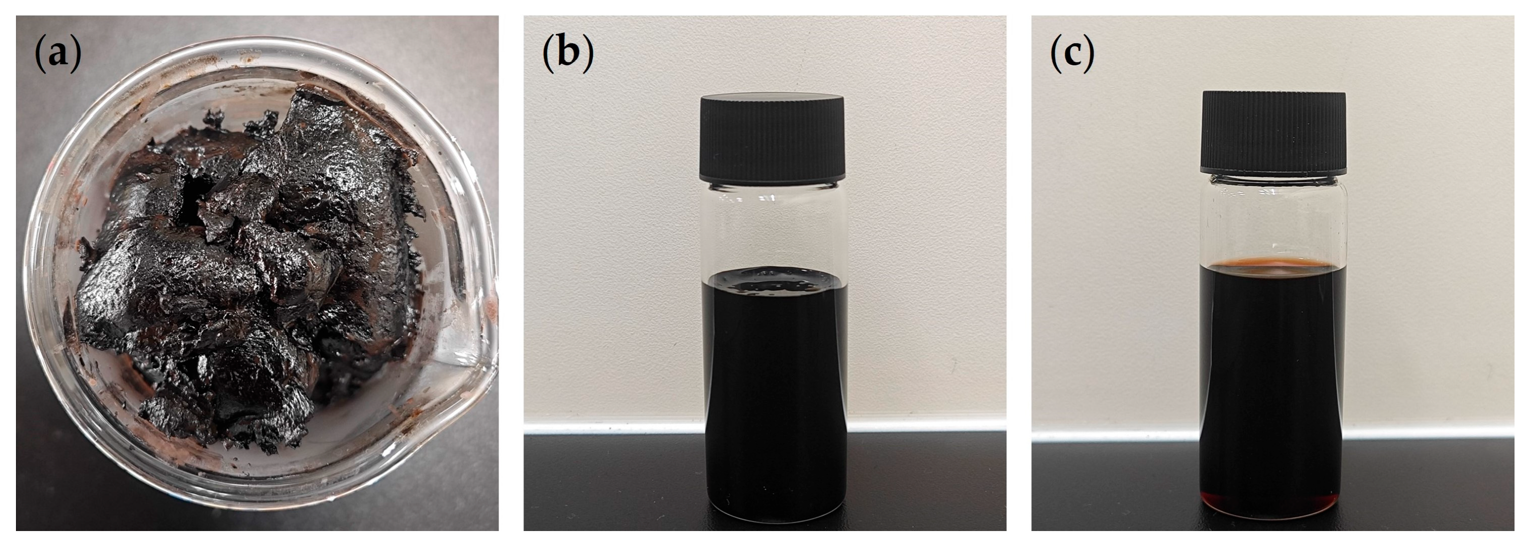 Figure 7. Photos of extra-heavy oil, coal tar, and washing oil: (a) extra-heavy oil; (b) coal tar; (c) washing oil.