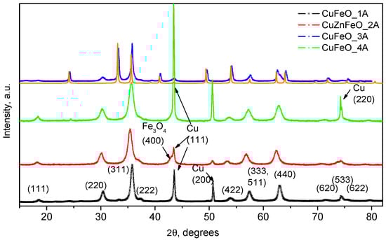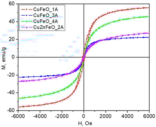 On the other hand, the lattice parameters of the cubic spinel phases in samples CuFeO_1A and CuFeO_4A are very close to those of pure magnetite Fe3O4 [,,], while that of CuZnFeO_2A agrees quite well with the lattice parameter of nanocrystalline ZnFe2O4 [,]. Better insight at the diffraction patterns, around the metallic copper phase reflections, is provided in the Supplementary Material, Figure S1. An example profile fitting to extract the constituent phases crystal lattice parameters is shown in Figure S2. The main microstructural and room-temperature magnetic properties are summarized in Table 1.