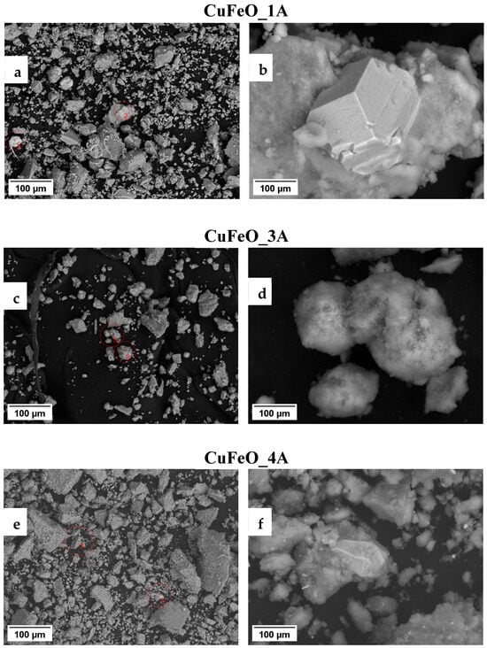 SEM images of the CuFeO_1A—(a,b), _3A—(c,d), and _4A—(e,f) samples, illustrating the agglomerated powder morphology—left side—and isolated copper crystalline particles—on the right side. Accelerating voltage was 20 kV, at SEM WD ~9 ÷ 9.5 mm, magnifications ×500 and ×5000, accordingly.