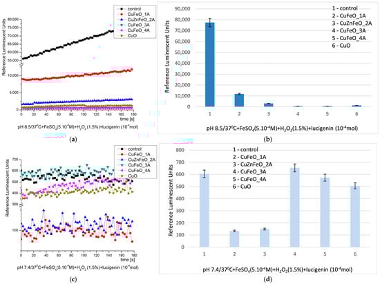 Fenton’s chemiluminescence induced by ·OH and ·OOH radicals at pH 8.5 ((a) kinetics, (b) maximums) and pH 7.4 ((c) kinetics, (d) maximums) and the effect of newly synthesized nano-ceramic materials (p ≤ 0.05).