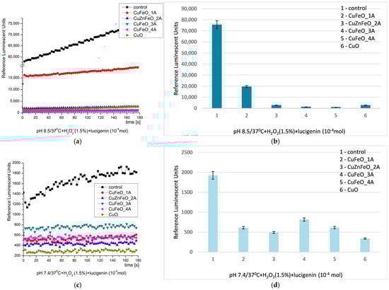 In this system, the strong oxidant hydrogen peroxide serves both as an oxidizing agent and an ROS. At alkaline pH, the kinetics curves were smooth and the signal in all the reactions was increasing slightly in time. The control system emitted most light. All the other tested samples demonstrated strong inhibition on the reaction: CuFeO_1A—almost 4 times, CuZnFeO_2A—28 times, CuFeO_3A—almost 63 times, CuFeO_4A—88 times (highest inhibition), and nCuO—28 times (similar to CuZnFeO_2A), Figure 7 [,,]. This is indicative of all the tested materials efficiently suppressing oxidation by H2O2 at alkaline conditions.