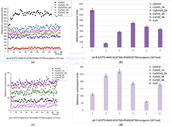 NAD.H-PhMS chemiluminescence induced by O2·− radicals at pH 8.5 ((a) kinetics, (b) maximums) and pH 7.4 ((c) kinetics, (d) maximums) and the effect of newly synthesized nano-ceramic materials (p ≤ 0.05).