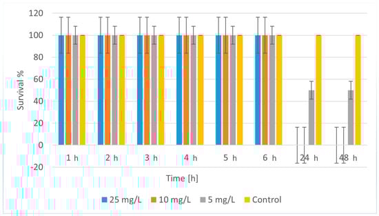In Figure 11, the results of the time dynamics of CuFeO_3A toxicity showed that at 5 mg/L, survival dropped in the first few hours, from 100% to 70%, after 2 h, and reached 50% at 4–6th h, after which by the 24th and 48th h, survival was nil.