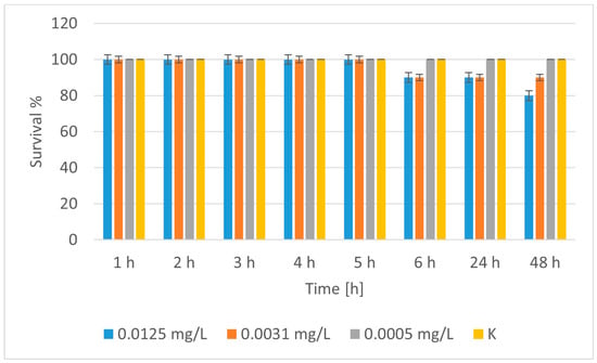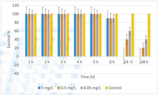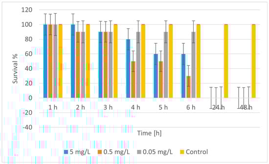 The results regarding the time dynamics of CuFeO_4A toxicity, Figure 12, showed that at 5 mg/L and 0.5 mg/L, there was a gradual decrease in survival within the first 6 h. At 5 mg/L, survival dropped from 100% to 60% in 5–6 h. At 0.5 mg/L, the drop was even more drastic, at 30% at the 6th h. After 24th and 48th h, at all concentrations, survival was 0%, i.e., complete mortality. The concentration-dependent effect showed that higher concentrations lead to faster and stronger toxicity. Even the lowest concentration (0.05 mg/L) caused complete mortality within 24 h, although during the first 6 h, survival was about 90%. Since mortality was 100% at all concentrations tested at the 24th and 48th h, it was not possible to calculate LC50 from these data, because even at the lowest concentration, mortality was complete. Therefore, CuFeO_4A is very toxic to daphnia, even at the lowest test concentration (0.05 mg/L), resulting in 100% mortality within 24 h. Toxicity began within the first few hours, but the effect was delayed, with a gradual decrease in survival. For a more accurate determination of LC50, it is necessary to study lower concentrations (below 0.05 mg/L). The control test confirmed that the mortality was caused by the exposure to the presumed active substance.