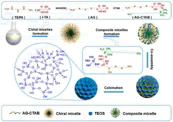 This soft-template method relies on chiral surfactants or supramolecules to create helical pores or chiral mesoporous structures through self-assembly. Chiral surfactants interact with silica precursors via electrostatic, hydrogen-bonding, or hydrophobic interactions, resulting in porous structures with defined chirality. Zhao’s group developed a chiral amide-gel-directed synthesis strategy to prepare mesoporous silica nanoparticles with molecular-scale chiral silicate skeletons (Figure 2) [19]. The process involved: (I) Forming nearly pure chiral amide gels (AG) by cross-linking amine-containing tetraethylenepentamine (TEPA) with carboxyl-containing tartaric acid (TA), (II) creating micelles from AG and cetyltrimethylammonium bromide (CTAB) via hydrogen bonding, (III) hydrolyzing and condensing tetraethyl orthosilicate (TEOS) around these micelles, forming ordered mesoporous structures. The charged interactions between amine and carboxyl groups in the micelles played a critical role in alkoxysilane hydrolytic polycondensation. Finally, the organic templates were removed by calcination at 700 °C, yielding the final chiral MSNs.