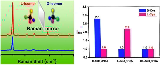 Schematic illustration the detection of enantiomers using chiral SiO2/PDA, and the relative values of I498 (Raman intensity at 498 cm−1) for Cys enantiomers mixed with D-, L-, and DL-SiO2/PDA. Reproduced from ref. [34] with permission from the ACS.