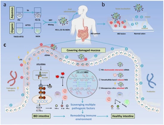 Xu et al. constructed mesoporous organosilica nanoparticles (MON) templated with PEI and L/D-TA complexes (PEI-L/D-TA@MON) as chiral nanomedicine for IBD (Figure 9) [51]. After oral administration, PEI-L-TA@MON exhibited a preferred conformation that stereochemically matched the mucosa and anchored onto the inflamed intestines, enabling targeted delivery to the lesion site. PEI-L-TA@MON could scavenge lipopolysaccharide, reactive oxygen species, and cell-free DNA, alleviate oxidative stress, suppress the inflammatory cascade, and maintain immune homeostasis, thereby achieving therapeutic effects for IBD. Furthermore, the rapid synthesis, low cost, energy-free preparation process, negligible toxicity, satisfactory therapeutic efficacy, and easy conversion of treatment modalities of PEI-L-TA@MON will bring revolutionary changes to the treatment of IBD, holding significant research value and clinical translation prospects.