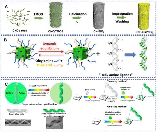 (A) Schematic diagram of the template-synthesis of CsPbBr3 confined in the mesoporous silica film with a chiral nematic structure. Reproduced from ref. [80] with permission from the Wiley-VCH GmbH. (B) Schematic diagram of the inorganic silica right (or left) handed nanohelices are used as chiral templates to induce optically active properties to CsPbBr3 PNCs grafted on their surfaces. Reproduced from ref. [75] with permission from the ACS. (C) Scheme of the H-PNC growth inside the hollow silica helical ribbons through one-step or two-step drop casting methods and the TEM images of empty and PNC filled silica helices. Reproduced from ref. [81] with permission from the ACS.