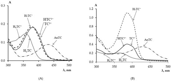 From the absorption spectra of TC in PMM (Figure 1B) after its solid-phase extraction from solutions of different acidity, it is evident that the pH of the solution affects the extraction of TC by the matrix from the solution. Table 1 presents the absorption maxima of the ionic forms of TC in aqueous solutions and in PMM depending on the medium acidity.