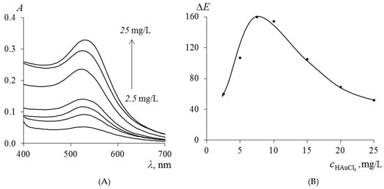 The influence of the concentration of gold nanoparticles (Au NPs) in PMM after the extraction of TC on the magnitude of the ∆E was varied by changing the concentration of the initial HAuCl4 solution in the range from 2.5 to 25.0 mg/L at the stage of immobilization of Au(III) ions. The absorption spectra of the obtained samples, presented in Figure 6A, demonstrate that with an increase in the concentration of HAuCl4, the intensity of the plasmon resonance maximum at 530 nm increases, which directly indicates an increase in the concentration of synthesized Au NPs in the polymer matrix. According to the data in Figure 6B, the ∆E reaches a maximum when using HAuCl4 solutions with a concentration of 5.0–7.5 mg/L for the synthesis of PMM-Au0.