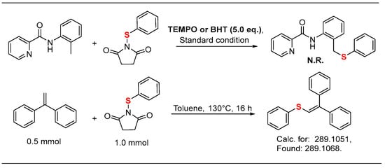 To gain more insights into the reaction mechanism, we incorporated 5.0 equivalents TEMPO or BHT into the reaction, and no desired products were obtained. Subsequently, the thioether radical was successfully trapped by 1,1-diphenylethylene and detected by ESI-HRMS (Figure 2).