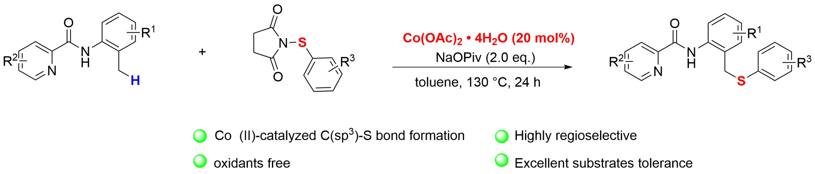 Herein, we disclose a novel and efficient cobalt-catalyzed cross-coupling strategy for picolinamide-directed direct C(sp3)-H bond formation with N-(phenylsulfanyl)succinimides. This method enables the direct construction of C(sp3)–S bonds under mild conditions and exhibits excellent functional group tolerance along with a broad substrate scope. Notably, the catalytic system achieves oxidative C–H functionalization without relying on costly or environmentally detrimental oxidants, offering a more sustainable and practical alternative for C–S bond formation.