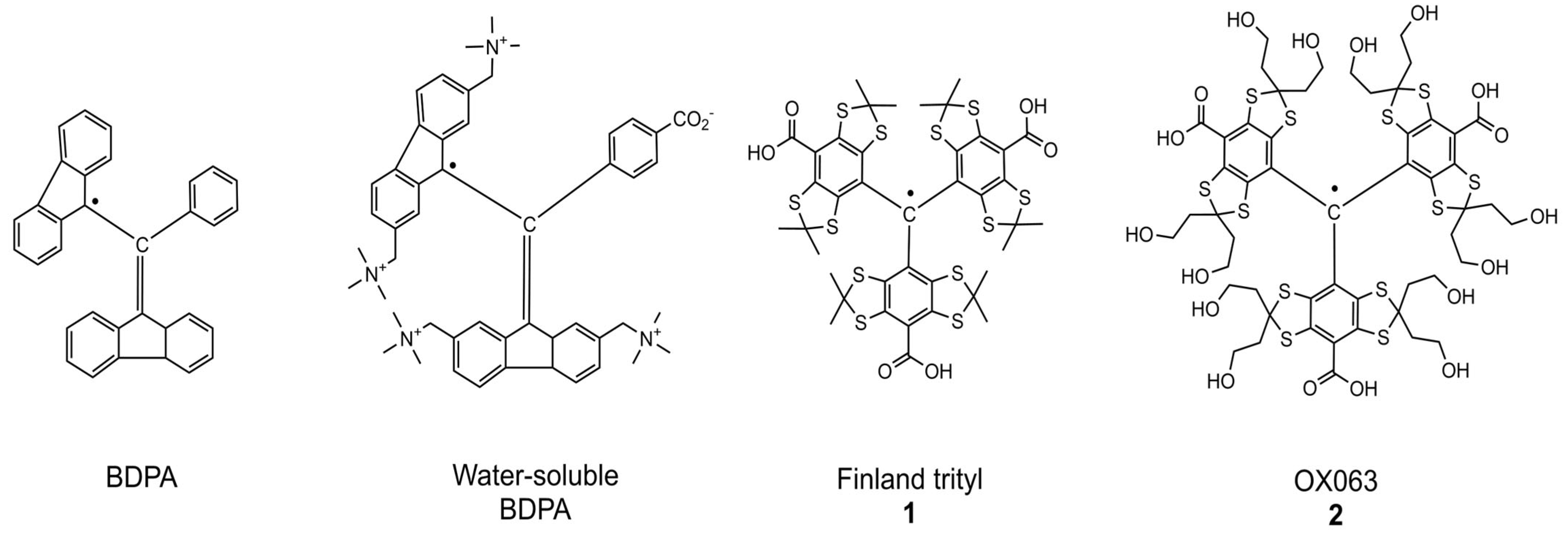 - Rogozhnikova, O.Y.; Vasiliev, V.G.; Troitskaya, T.I.; Trukhin, D.V.; Mikhalina, T.V.; Halpern, H.J.; Tormyshev, V.M. Generation of Trityl Radicals by Nucleophilic Quenching of Tris (2, 3, 5, 6-tetrathiaaryl) methyl Cations and Practical and Convenient Large—Scale Synthesis of Persistent Tris (4-carboxy-2, 3, 5, 6-tetrathiaaryl) methyl Radical. Eur. J. Org. Chem. 2013, 2013, 3347–3355. [Google Scholar] [CrossRef]