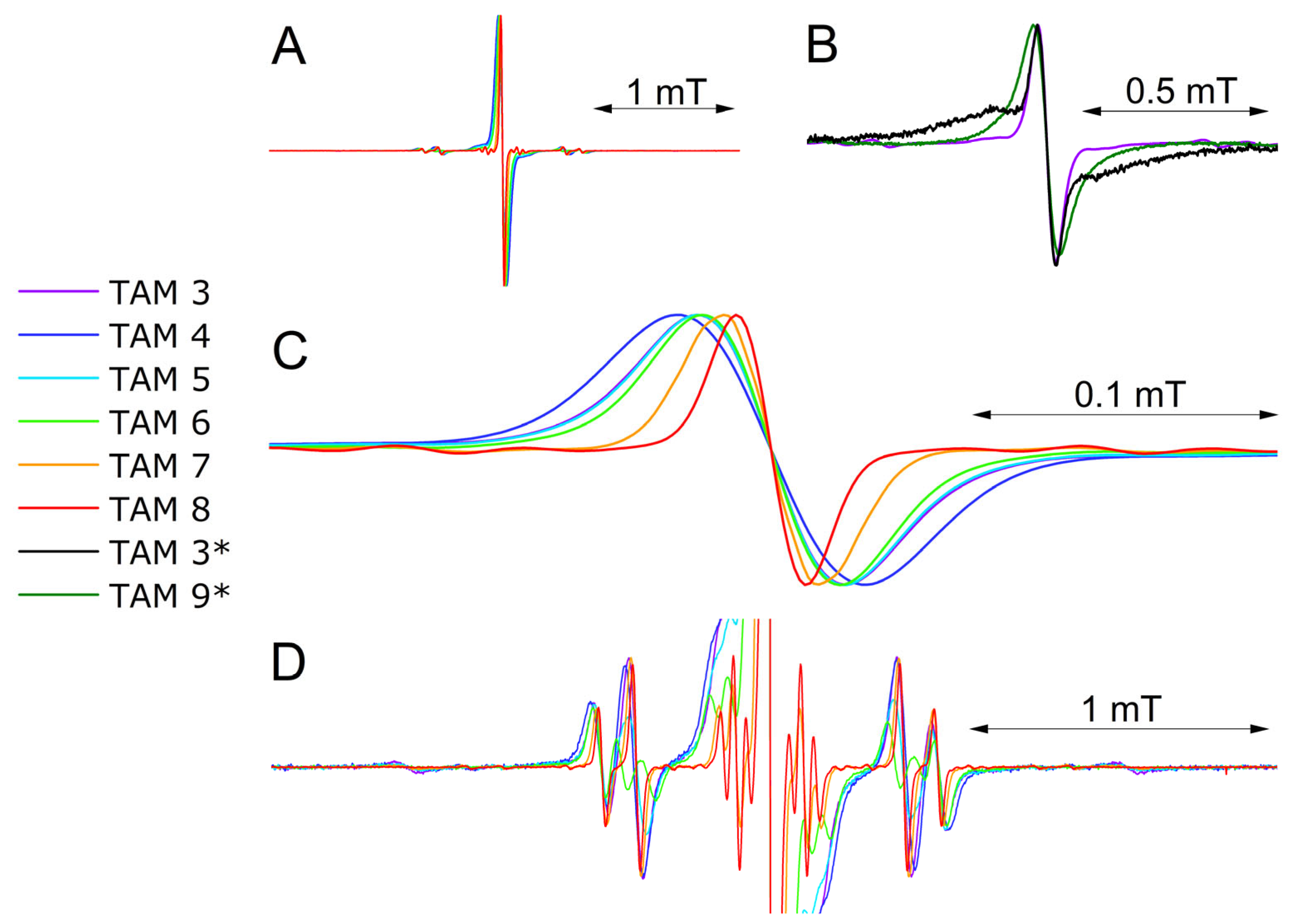 - Trukhin, D.V.; Rogozhnikova, O.Y.; Troitskaya, T.I.; Vasiliev, V.G.; Bowman, M.K.; Tormyshev, V.M. Facile and high-yielding synthesis of TAM Biradicals and Monofunctional TAM radicals. Synlett 2016, 27, 893–899. [Google Scholar] [PubMed]