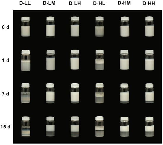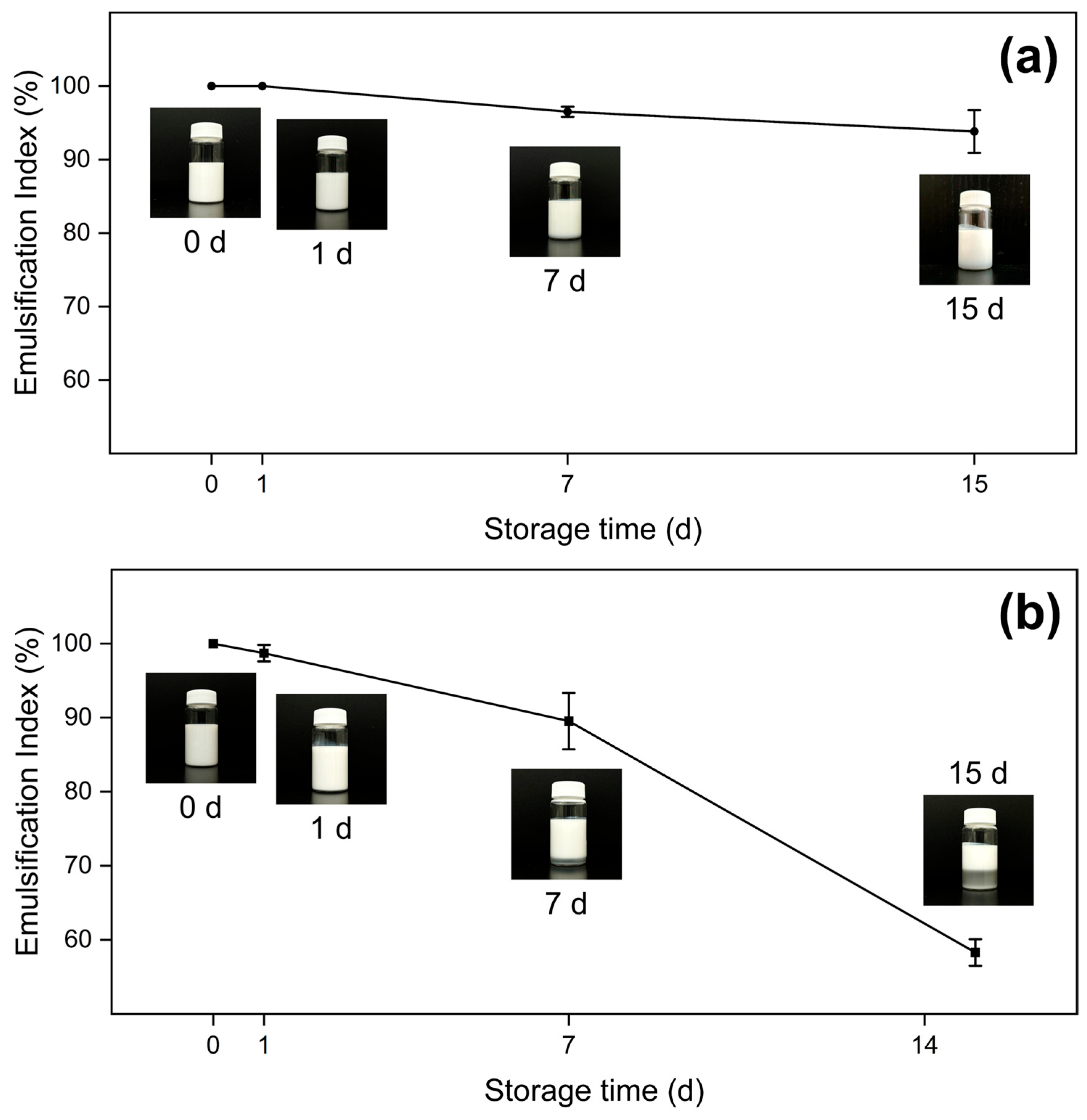 The emulsification index (EI) is defined as the ratio between the height of the emulsion layer () and the total height of the sample (). All samples were stored at room temperature for 15 days, and their EI were calculated using Equation (2).