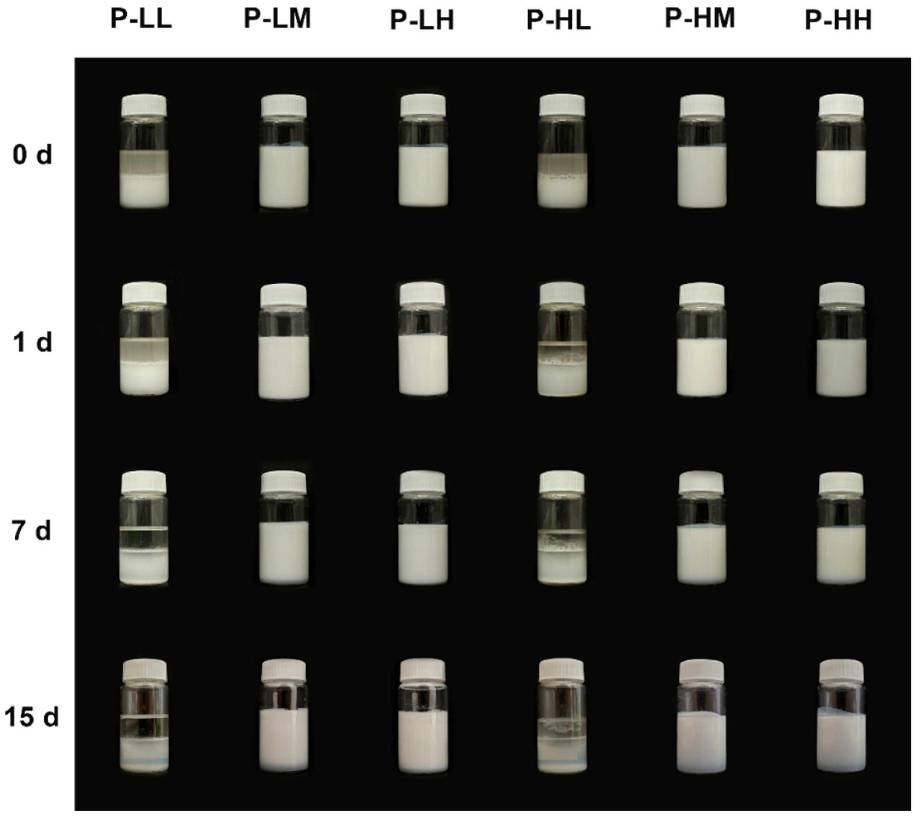 Physical stability of different formulations of liquid paraffin-water emulsions stabilized with SiO2 NPs modified with adsorbed OA, where: LL refers to low concentration of SiO2 NPs and low concentration of OA; LM refers to low concentration of SiO2 NPs and medium concentration of OA; LH refers to low concentration of SiO2 NPs and high concentration of OA; HL refers to high concentration of SiO2 NPs and low concentration of OA; HM refers to high concentration of SiO2 NPs and medium concentration of OA; and HH refers to high concentration of SiO2 NPs and high concentration of OA. Pictures were taken after immediately after emulsification (0 h), 1 day after (1 d), 7 days (7 d) and 15 days (15 d).