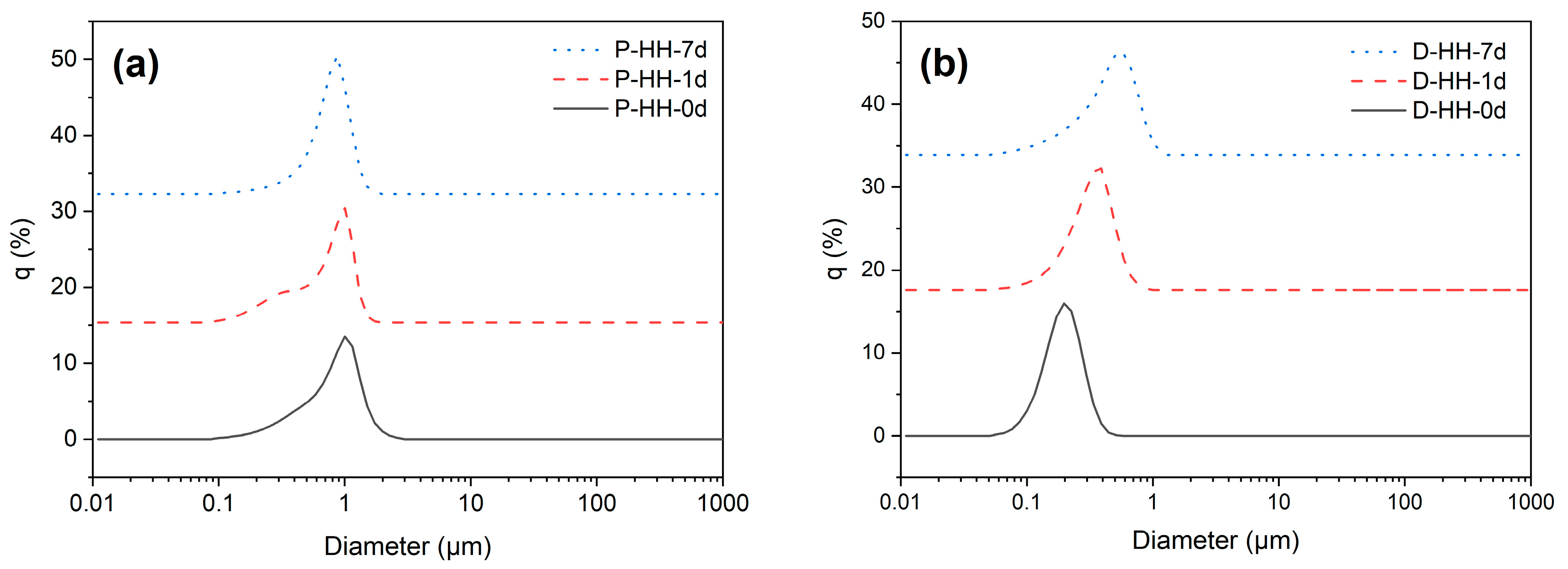 Another parameter to consider when characterizing emulsions is droplet size [44]. Only the most stable emulsions for each oil phase were analyzed, considering the previous stability analysis, namely P-HH and D-HH. Figure 7a,b show the size distributions of paraffin and dodecane emulsions, respectively, measured at three times: immediately after preparation (0 d), after one day (1 d), and after one week (7 d).