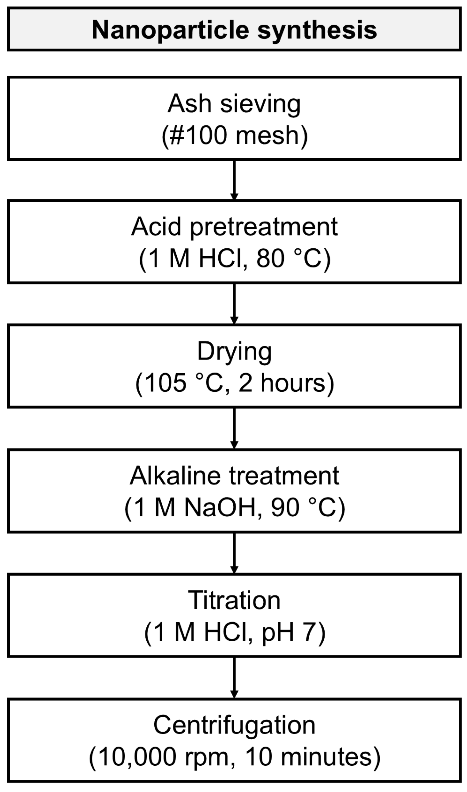 Synthesis of silica nanoparticles was carried out using a method based on previous works with some modifications [4,27], Figure 8 presents a scheme of the synthesis process. Initially, the raw material was sieved with a #100 mesh equivalent to an average particle size of 150 μm to achieve a uniform size distribution. Subsequently, the product underwent an acid pretreatment with 1 M hydrochloric acid (HCl) at 80 °C, continuously stirred for 1 h, with the purpose of removing metal ions and oxides. The insoluble matter was washed with deionized water until a pH of 5 was reached, then dried at 105 °C for 2 h. An ash/acid solution ratio of 1:10 by weight was used for this reaction.