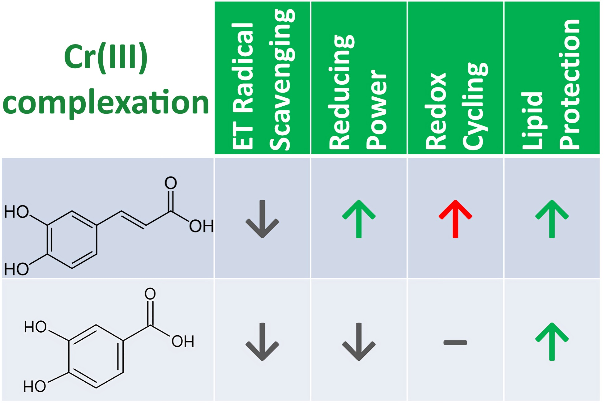 It is important to emphasize that, despite observed reductions in oxidative stress markers in some models, chromium picolinate and nicotinate are not regarded as direct antioxidants, since their ligands—picolinic and nicotinic acids—lack intrinsic redox activity [8]. In contrast, phenolic acids such as caffeic acid and 3,4-dihydroxybenzoic acid provide a stronger biological rationale. Belonging to the catechol family (throughout this manuscript, we use the term “catechol moiety” to refer specifically to the adjacent dihydroxy group and “catechol family” to refer more broadly to compounds (such as CA and 3,4-DHBA) that contain this structural motif), they possess adjacent hydroxyl groups that are potent electron donors and form stable complexes with trivalent chromium. These ligands not only contribute to complex stability and bioavailability but also bring inherent antioxidant and anti-inflammatory properties [9,10]. When complexed with chromium, catecholic ligands could therefore combine chromium’s regulatory and insulin-sensitizing functions with direct radical scavenging activity, offering a dual biological effect.