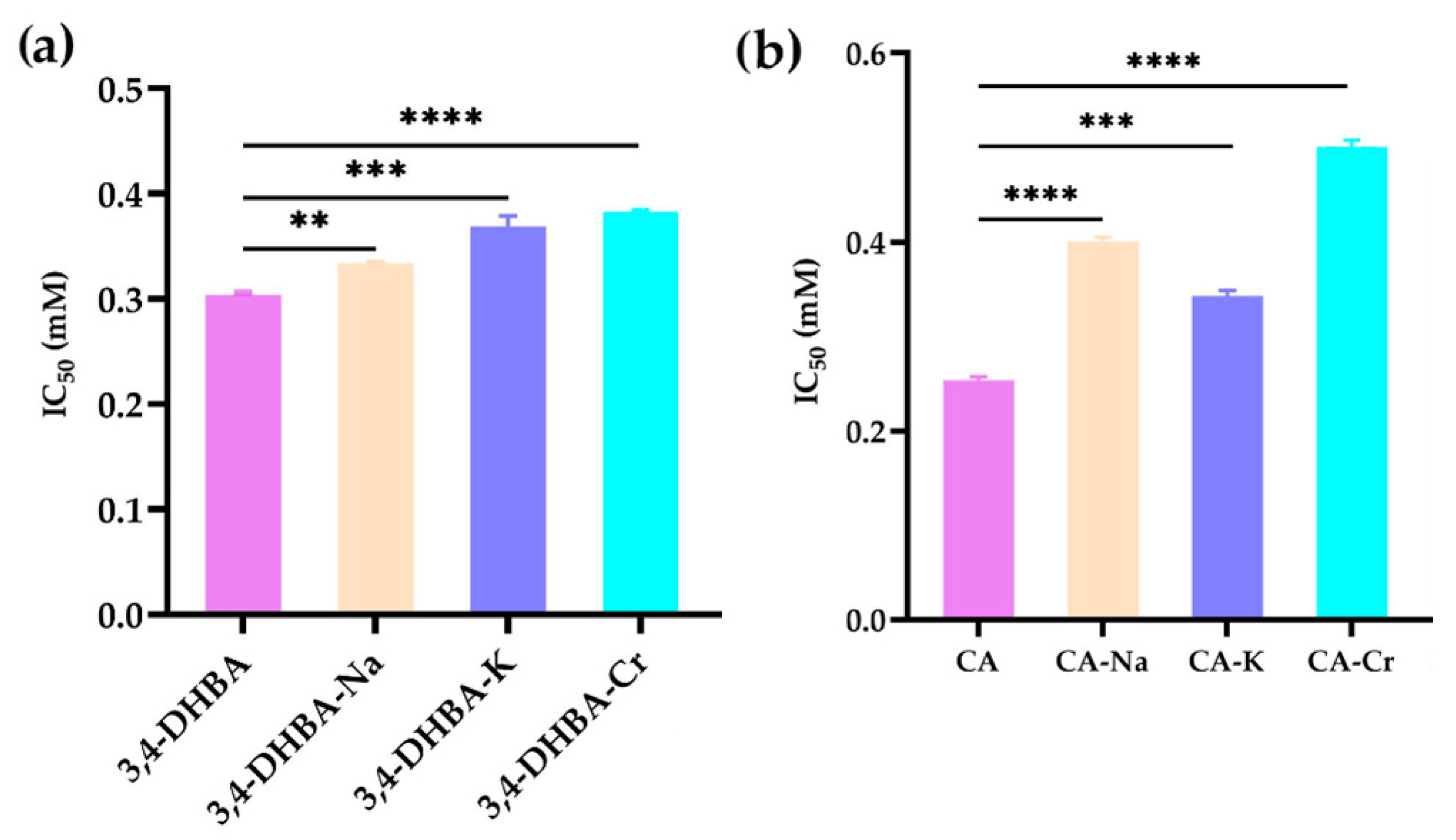 Figure 2. ABTS+ radical scavenging activity of Na, K, and Cr 3,4-dihydroxybenzoates (a) and caffeates (b). The stars denote statistical significance: ** p ≤ 0.01, *** p ≤ 0.001, **** p ≤ 0.0001.