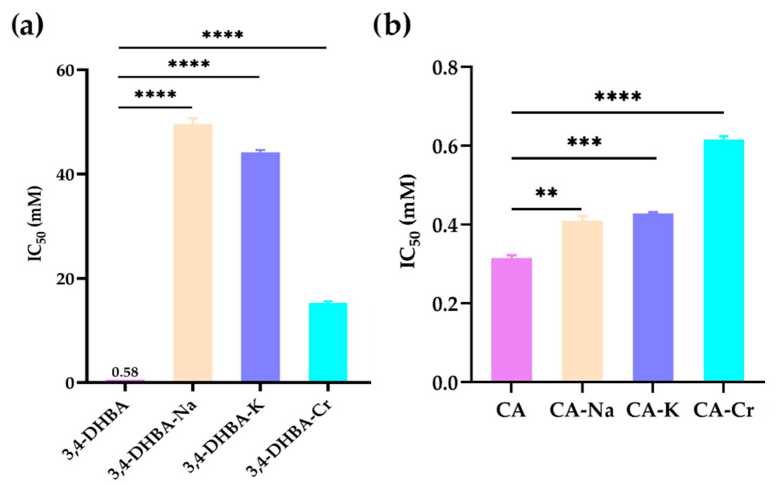 Figure 3. DPPH• radical scavenging activity of Na, K, and Cr, 3,4-dihydroxybenzoates (a), and caffeates (b). The stars denote statistical significance: ** p ≤ 0.01, *** p ≤ 0.001, **** p ≤ 0.0001.