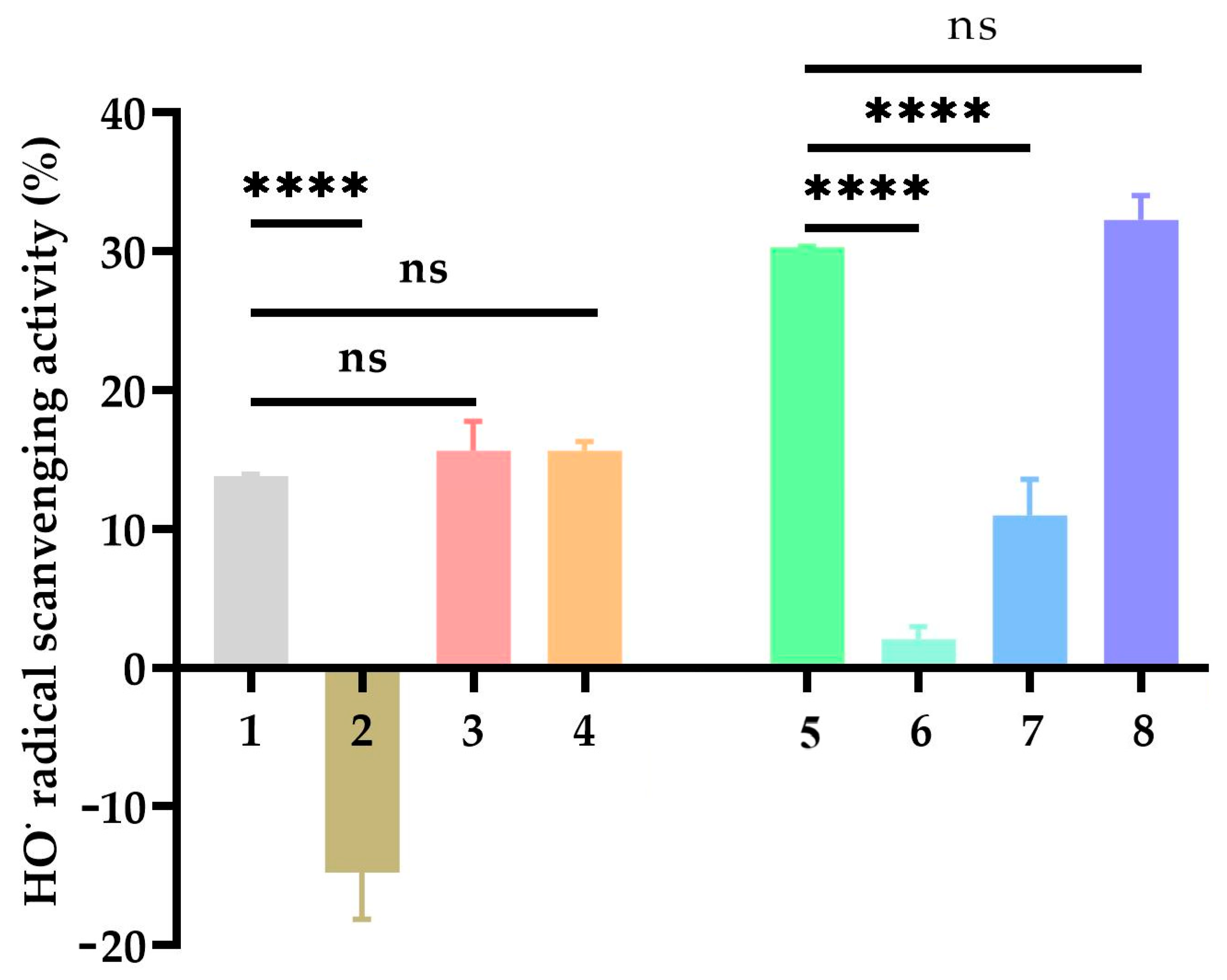 Figure 4. Hydroxyl radical (OH) scavenging activity of Na, K, and Cr 3,4-dihydroxybenzoates and caffeates (1 mM). 1: 3,4-DHBA; 2: 3,4-DHBA-Na; 3: 3,4-DHBA-K; 4: 3,4-DHBA-Cr; 5: CA; 6: CA–Na; 7: CA–K; 8: CA–Cr; The stars denote statistical significance: **** p ≤ 0.0001. ns—nonsignificant statistically.