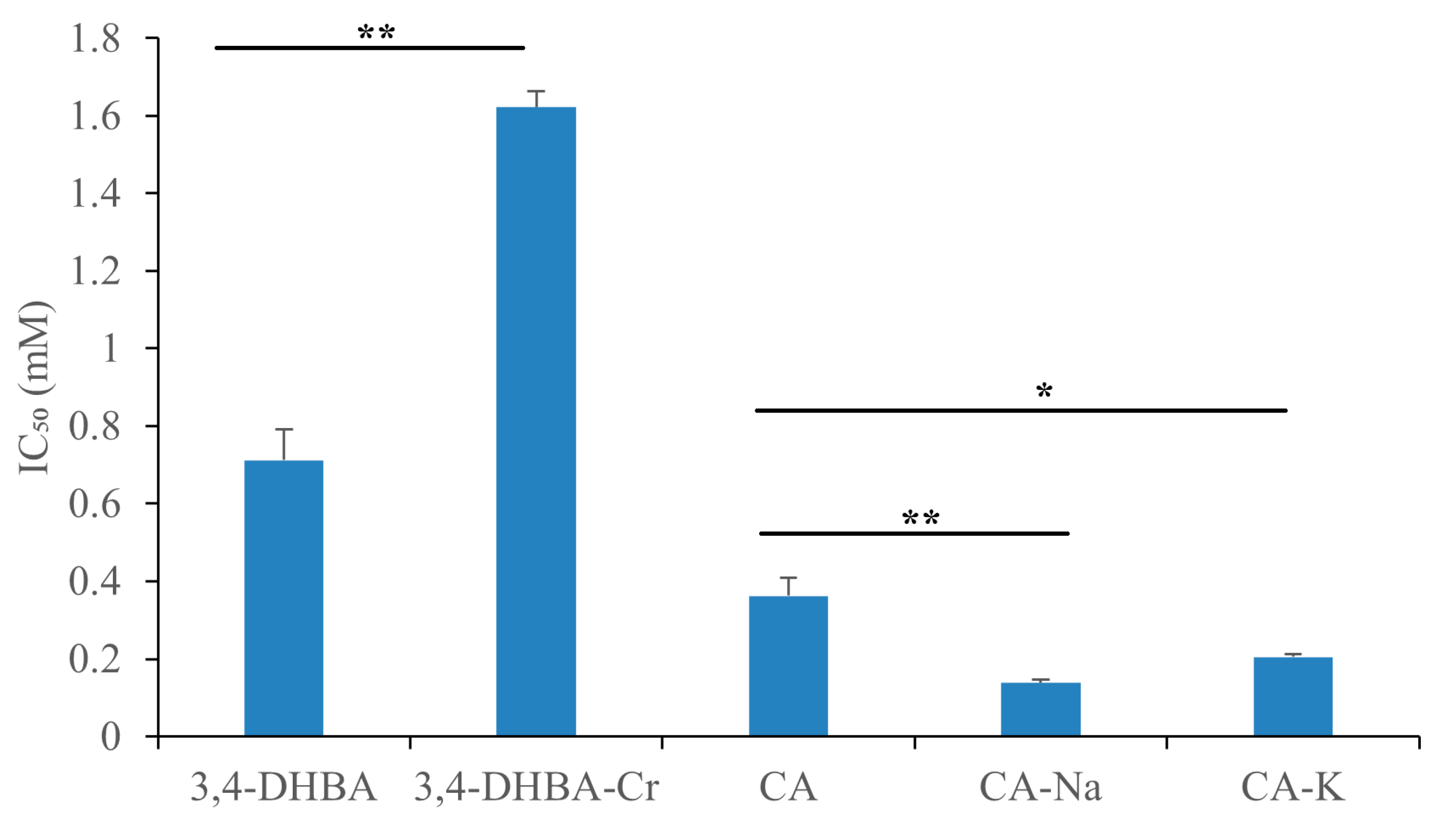 Figure 5. Superoxide radical (O2) scavenging activity of Cr 3,4-dihydroxybenzoates and Na and K caffeates. The stars denote statistical significance: * p ≤ 0.05, ** p ≤ 0.01.