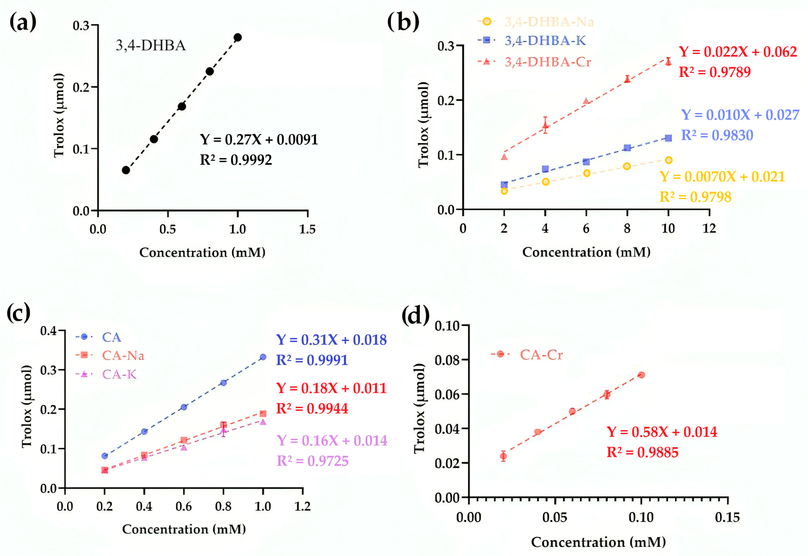 Figure 7. CUPRAC activity of 3,4-dihydroxybenzoic acid (a) and its derivatives: Na, K salts, and Cr complex (b). CUPRAC activity of caffeic acid, CA–Na, and CA–K (c). CUPRAC activity of CA–Cr (d).