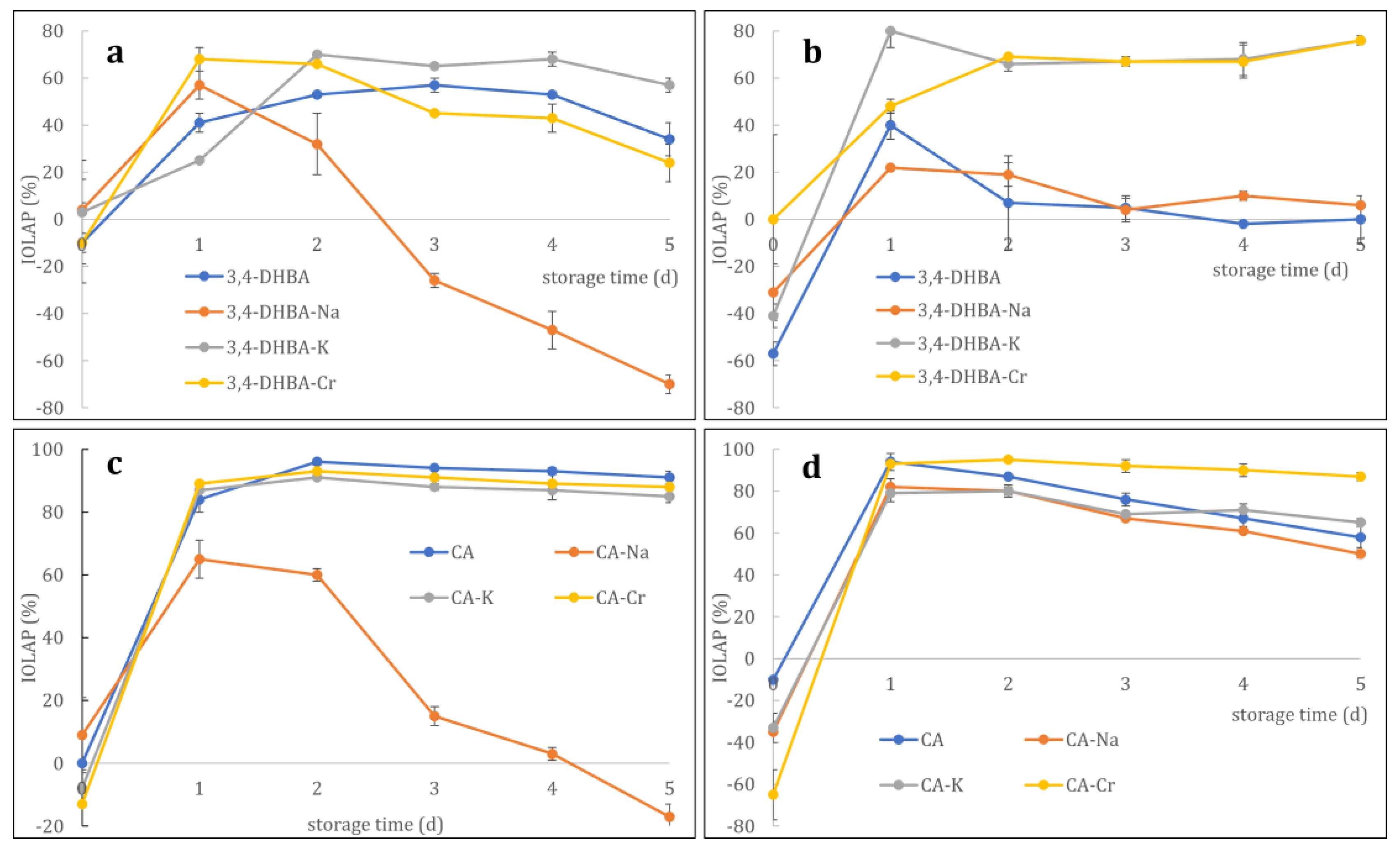 Figure 8. Linoleic acid peroxidation of Na, K, and Cr 3,4-dihydroxybenzoates and caffeates. 5 μM: (a) and (c). 10 μM: (b) and (d).