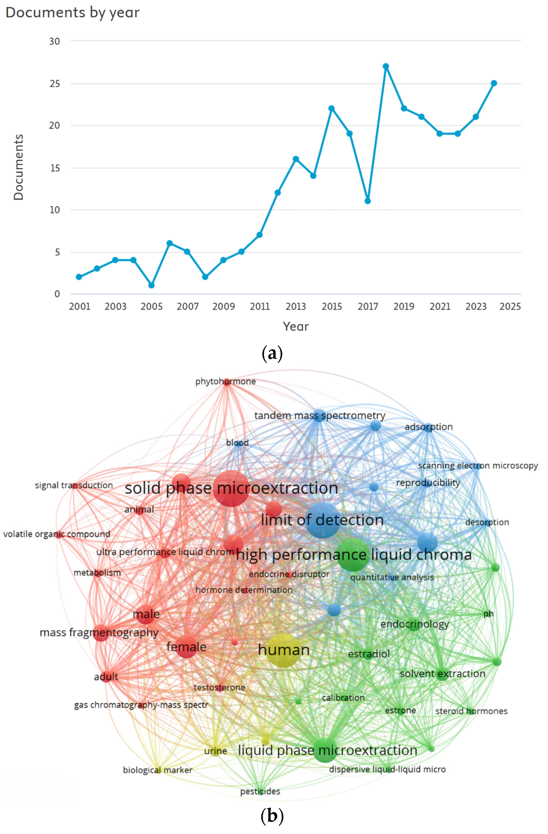 Figure 1b) reveals strong associations with terms such as “solid phase microextraction”, “high performance liquid chromatography”, “limit of detection”, and “human”. This network visualization illustrates the conceptual interconnectivity and thematic clustering among these terms, reflecting a growing interdisciplinary interest in hormone microextraction from bioanalytical matrices within the broader context of green analytical chemistry.