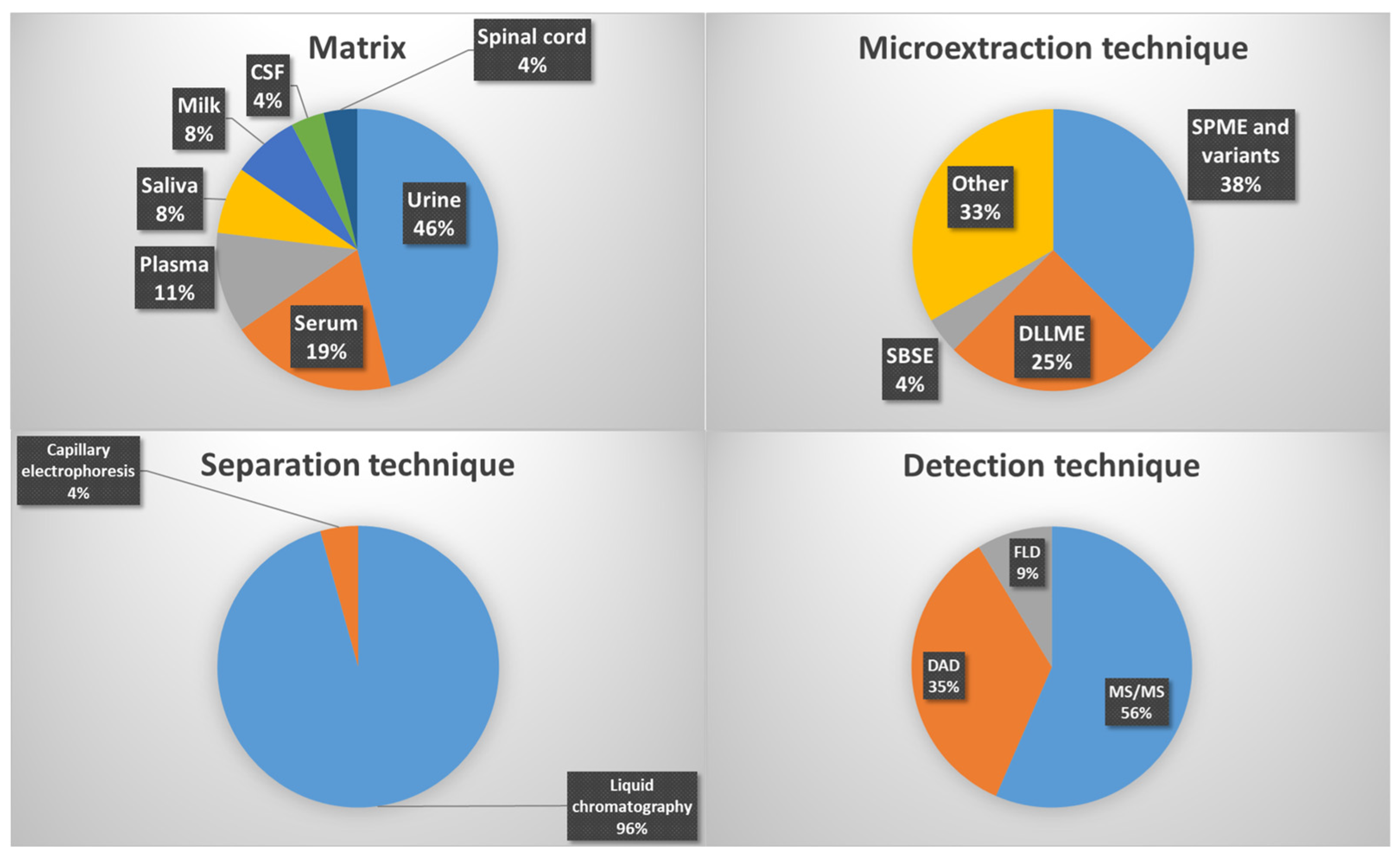 Figure 3). The most frequently analyzed matrices are urine (46%), serum (19%), plasma (11%), saliva and milk (8%), and cerebrospinal fluid (CSF) (4%). Regarding separation techniques, liquid chromatography is by far the most employed (96%), while for detection and quantification, MS/MS (56%), DAD (35%), and fluorescence detection (FLD) (9%) predominate.
