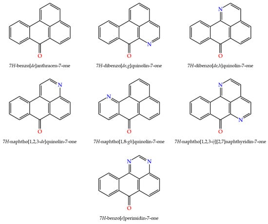 Benzanthrone derivatives featuring nitrogen atoms in the molecular core (see Figure 1), known as azabenzanthrones, have also been documented in the literature. Such compounds include the naturally occurring 6-azabenzanthrone (7H-dibenzo[de,g]quinolin-7-one), also known as oxoaporphine, and 1-azabenzanthrone (7H-dibenzo[de,h]quinolin-7-one), also known as oxoisoaporphine, which are alkaloids with anti-inflammatory, antiprotozoal, and anticancer activities [14,15,16,17,18,19,20,21,22,23,24,25,26,27,28,29]. The synthesis of substituted 3-azabenzanthrone derivatives and theoretical studies on their optical and nonlinear optical properties have also been reported [30,31]. More recently, the synthesis of 11-azabenzanthrone and its amino derivatives as photosensitizers for cancer therapy has been described [32].