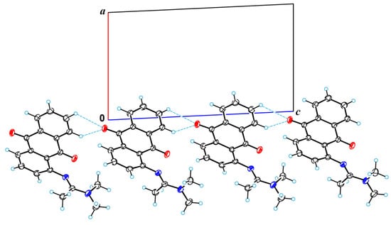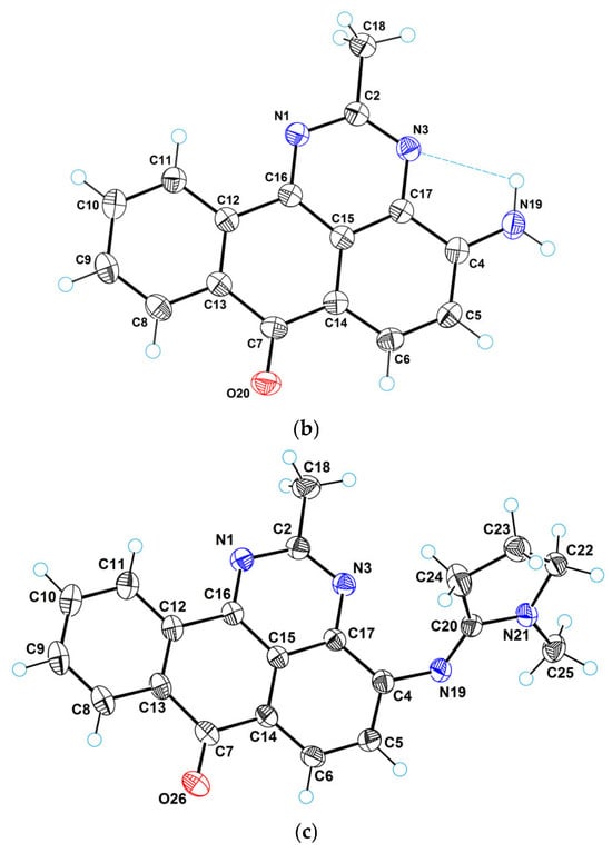 Figure 2 provides a perspective view of molecular structures 2, 4, and 5, respectively, with thermal ellipsoids and the atom numbering scheme. Molecule 2 is characterized by the usual geometry of the anthraquinone fragment. The planar dimethylacetimidamide group cannot be coplanar with the anthraquinone system, due to steric hindrance. That is why this group is turned and forms a dihedral angle of 81.9(2)° with the anthraquinone system. Such a high value of the dihedral angle does not promote conjugation; therefore, the length of the C1−N11 bond (1.384(1) Å) exceeds the standard value for Car−Nsp2 bonds [44].