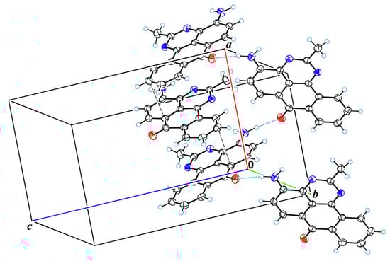 The polycyclic aromatic system in derivative 4 is planar and resembles the polycyclic system in benzanthrone. The atoms C18, N19, and O20 lie in the plane of the polycyclic system. The amino group is characterized by trigonal planar geometry and participates in the formation of hydrogen bonds. One of these bonds (the bond N19H···N3) is intramolecular with the length of 2.741(2) Å (H19b···N3 = 2.36(2) Å, N19−H···N3 = 104(3)°). The second hydrogen bond is intermolecular NH···O type bond with the length of 2.918(2) Å (H19a···O20 = 1.98(2) Å, N19−H19a···O20 = 164(2)°). Due to this intermolecular bond, molecular chains are formed in the crystal structure along the smallest lattice parameter (along parameter a). Intermolecular π-π stacking interactions with the smallest atom-atomic contact of 3.311(3) Å (C10···C14 contact) are also observed in the crystal structure. Figure 4 shows a fragment of the packing of 4 molecules in the crystal lattice.