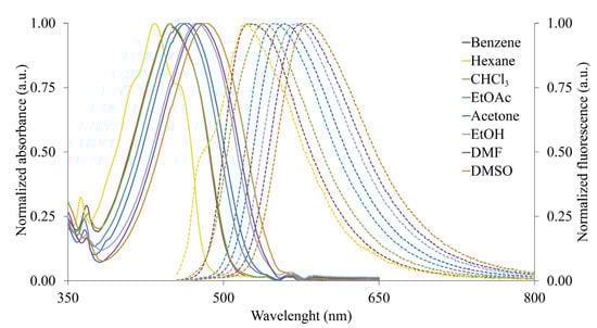 The fluorescence emission spectra were recorded using an FLSP920 (Edinburgh Instruments Ltd., Livingston, UK) spectrofluorometer in the visible range 450–800 nm, and the absorption spectra were obtained using the UV–visible spectrophotometer SPECORD® 80 (Analytik Jena AG, Jega, Germany). The spectral properties of the investigated compound were measured at an ambient temperature in quartz cuvettes of 10 mm in hexane, benzene, chloroform, ethyl acetate (EtOAc), acetone, ethanol (EtOH), dimethyl sulfoxide (DMSO), and dimethylformamide (DMF) with a concentration of 10−5 M. The quantum yields were measured relative to rhodamine 101 as the standard.