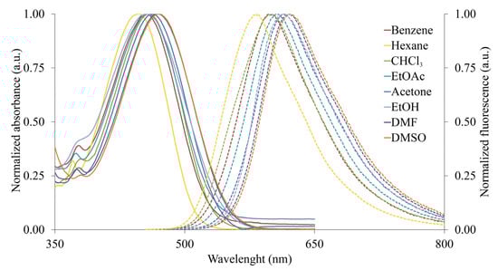 To investigate the photophysical characteristics of the synthesized compounds, UV–Vis absorption and fluorescence emission spectra in solvents of varying polarity (benzene, chloroform, ethyl acetate, acetone, N,N-dimethylformamide, dimethyl sulfoxide, and ethanol) were acquired. Table 1 provides a summary of the data, including the absorption maxima, molar attenuation coefficients, and emission maxima. For the studied compounds 4 and 5, the absorption and fluorescence spectra are shown in Figure 5 and Figure 6.