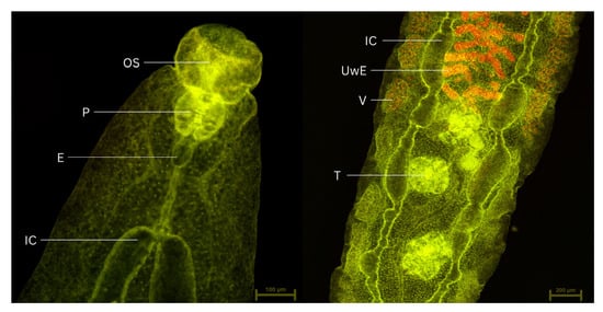 Adult Opisthorchis felineus stained with the examined dye 5, showing the internal structure: OS: oral sucker, P: pharynx, E: esophagus, IC: intestinal caeca, VG: vitellaria glands, O: ovary, UwE: uterus filled with eggs, T: testis. CLSM was performed using 488 nm and 638 nm lasers.