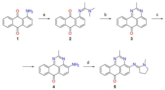 2-Methyl-4-amino-7H-benzo[e]perimidin-7-one (4) was obtained by condensation of 1-aminoanthraquinone (1) with N,N-dimethylacetamide and subsequent cyclization of the resulting (N’-(9,10-dioxo-9,10-dihydroanthracen-1-yl)-N,N-dimethylethanimideamide (2) to 2-methyl-7H-benzo[e]perimidin-7-one (3) and its amination, according to the procedure described by Yan-Ping Li and coworkers [41].
